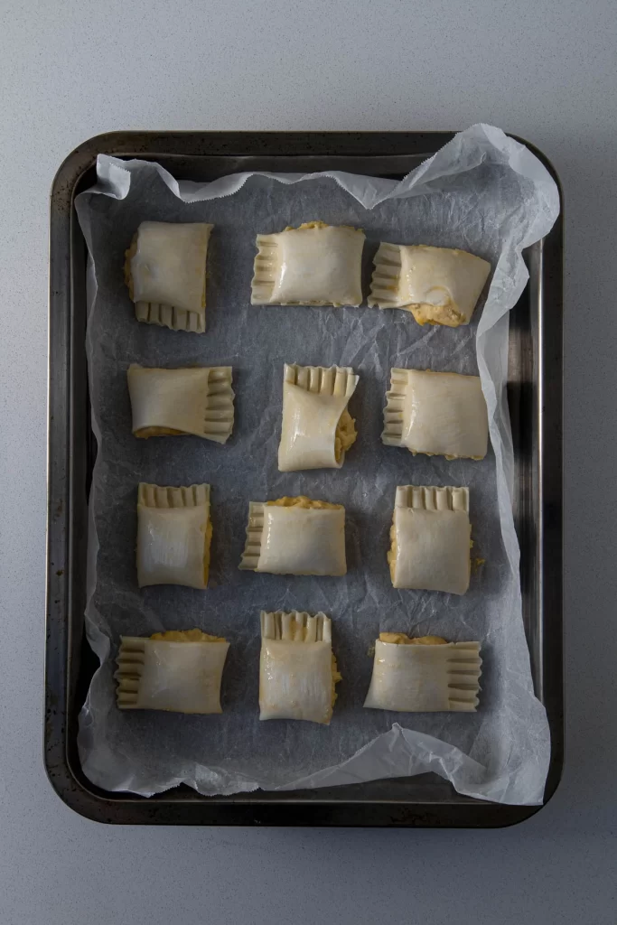Step 8: Brush one long edge of the pastry with milk, water, or a beaten egg, about 2cm wide. Fold the pastry over the cheese filling and press the long edges together. Use a fork to crimp the edges. Then, use a sharp knife to cut the pastry into mini rolls, about 4cm wide.